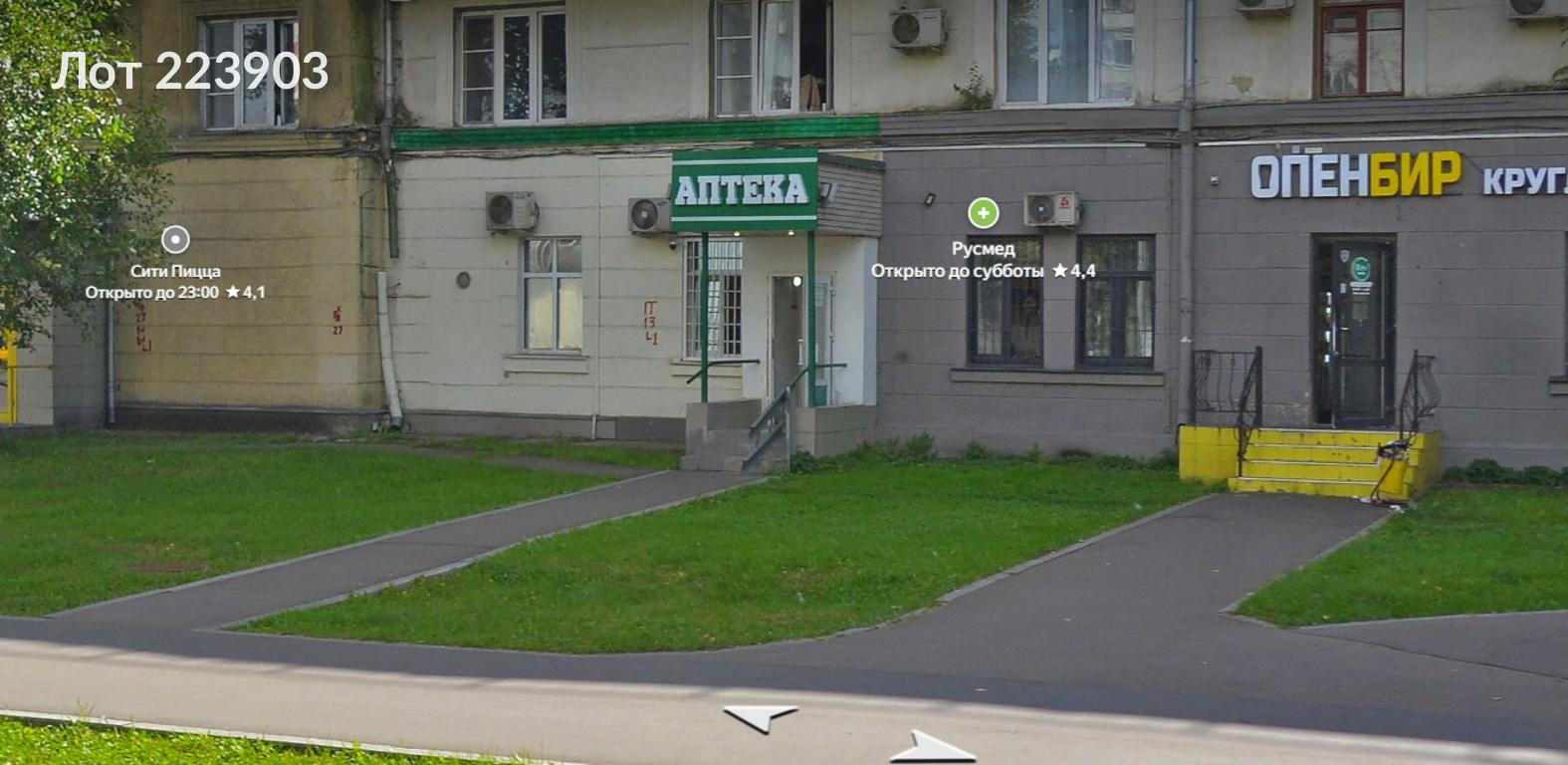 Лот № 223903 Продажа помещения (готовый арендный бизнес) 60м2, 400 м от метро. Арендатор - аптека, договор с пролонгацией на год. МАП 210 000, окупаемость 9,5 лет. 2 отдельных входа, мокрая точка, хорошая проходимость (первая линия домов).